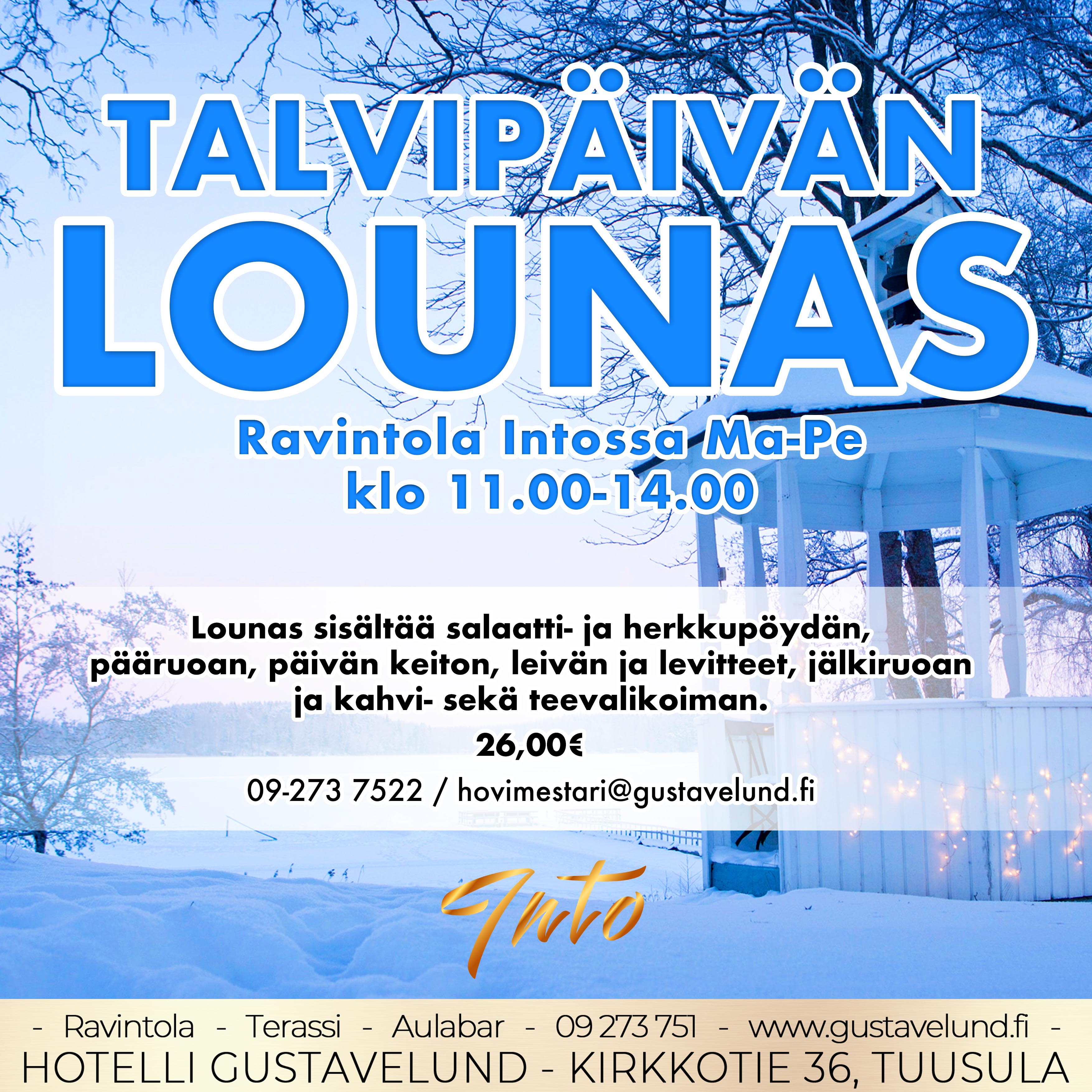 Lounas sisältää salaatti- ja herkkupöydän, pääruuan, päivän keiton, leivän ja levitteet, jälkiruoan ja kahvin, erikoiskahvit ja teevalikoiman.