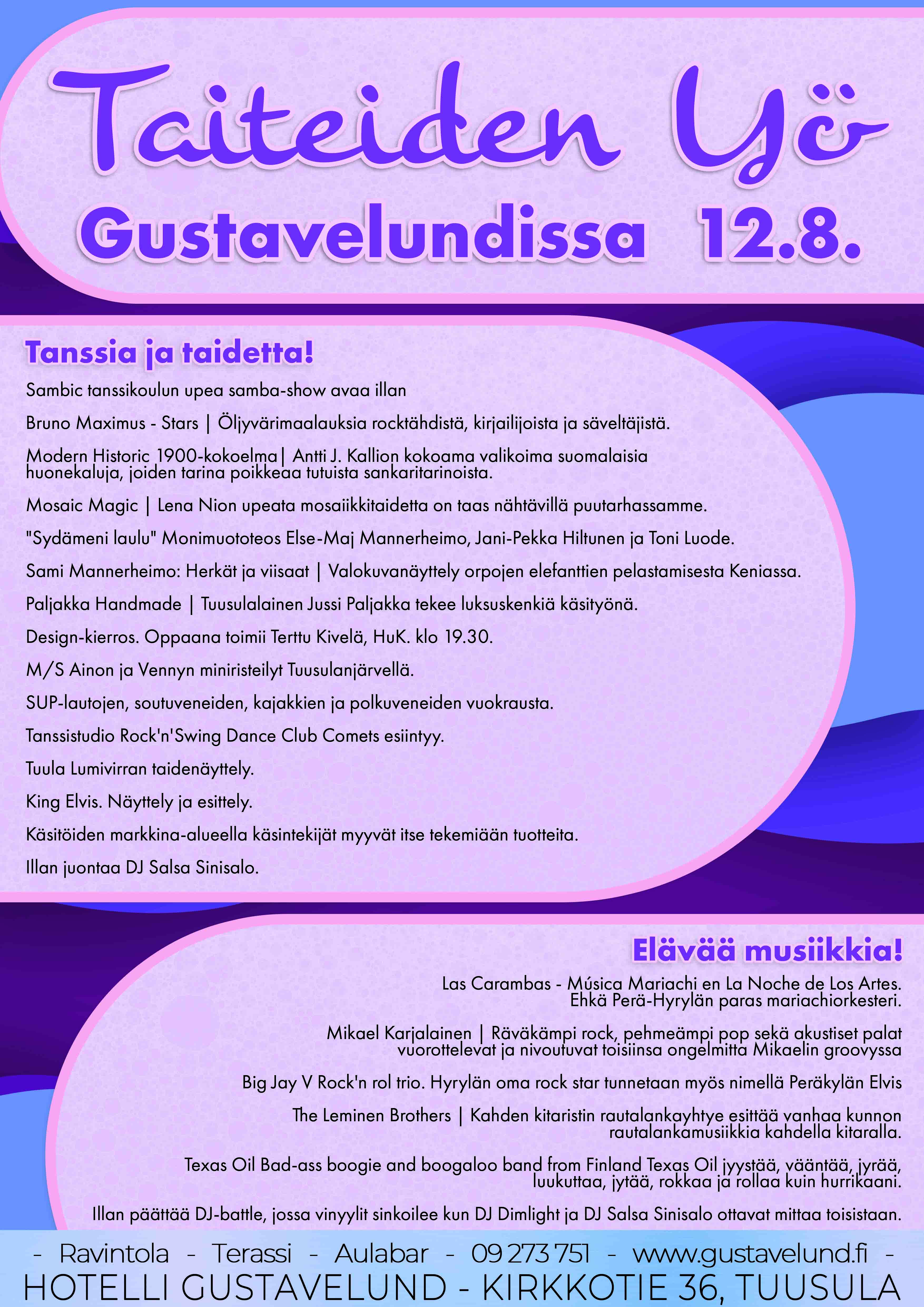 Tuusulan Taiteiden Yön Gustavelunissa juontaa DJ Salsa Sinisalo. Tiskijukkien Suomen mestari.
