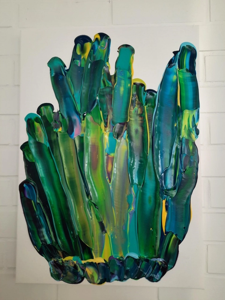Rakastan erilaisia värejä, ja fiiliksestä riippuen maalaan niin runsasvärisiä kuin hyvin hillittyjäkin maalauksia. Koen tärkeäksi maalata erilaisilla tekniikoilla ja eri värejä hyödyntäen. Käytän pääasiassa akryylimaaleja, mutta vaihtelun vuoksi pyrin maalatessani toisinaan käyttämään muitakin materiaaleja, kuten hiekkaa tai vaikkapa alkoholimustetta.