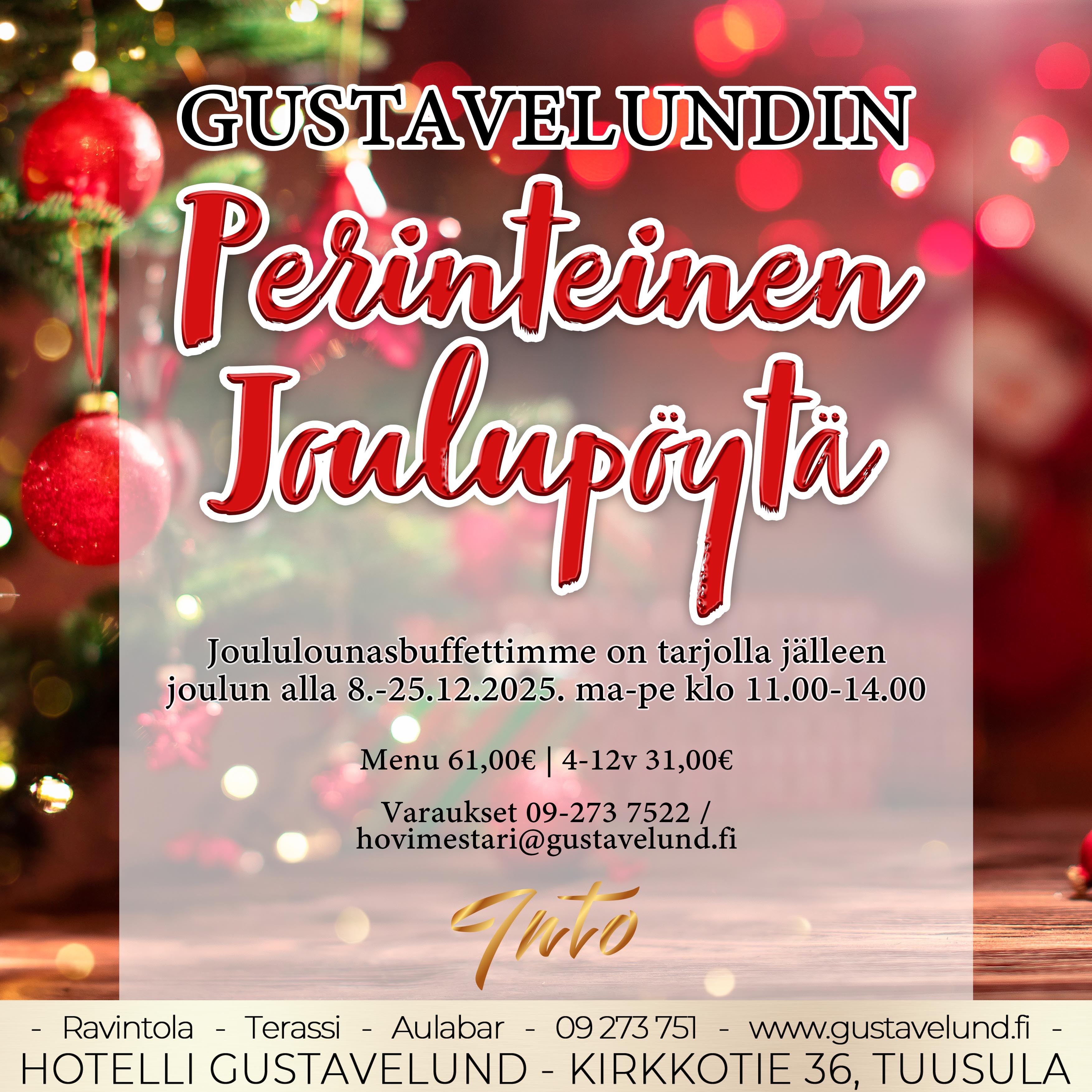 Ryhmävaraukset joulupöytään myyntipalvelusta (09) 273 7555 sales@gustavelund.fi