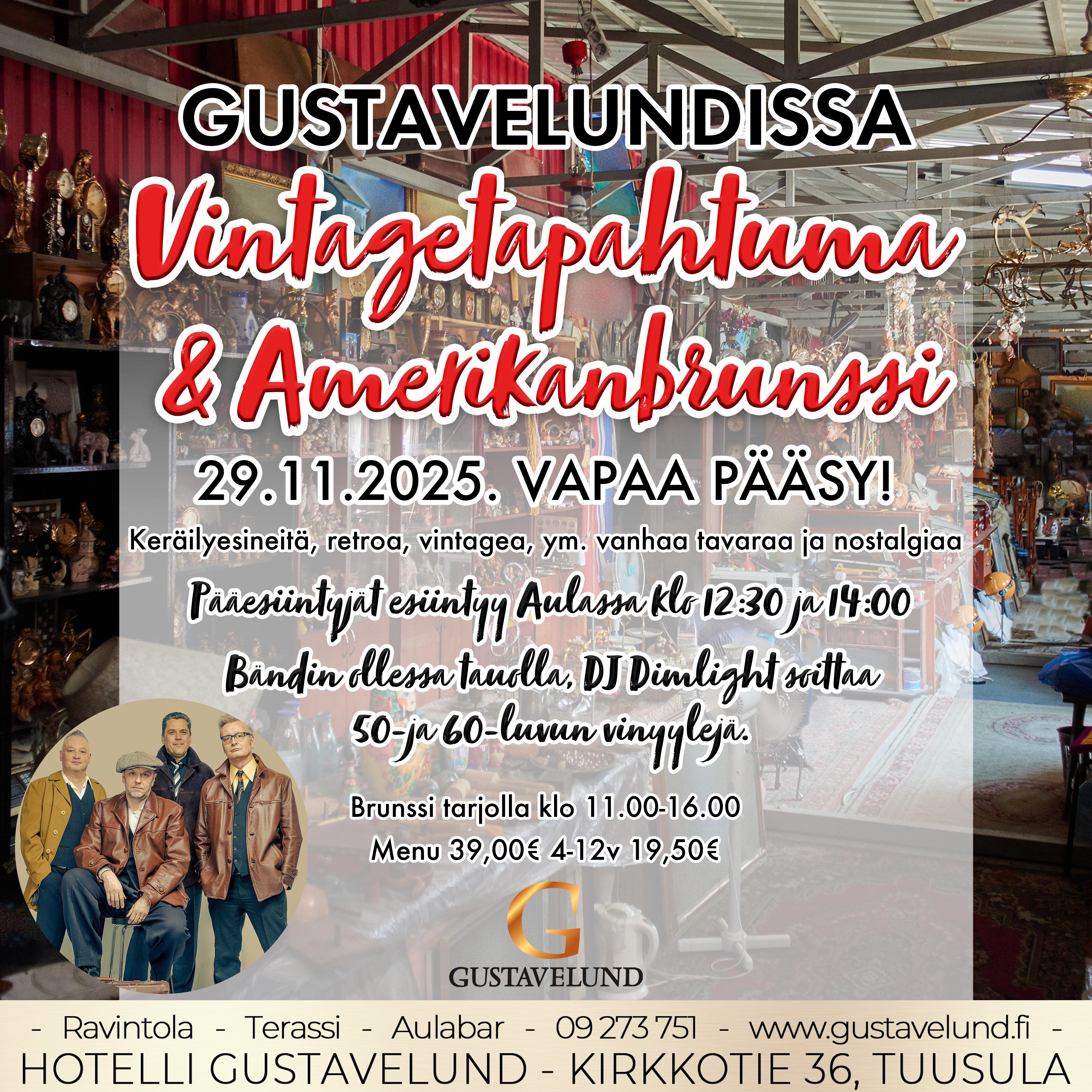 Brunssi tarjoillaan Ravintola INTO.ssa. Bändi soittaa aulassa, jossa palvelevat sekä Aulabaari ja vintagekauppiaat.
