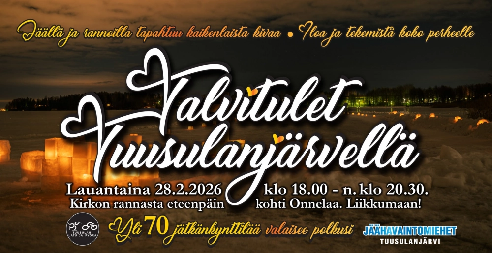 Tervetuloa kokemaan taianomainen talvi-ilta Tuusulanjärven jäälle Kalevalan päivänä, kun kymmenet jätkänkynttilät syttyvät.